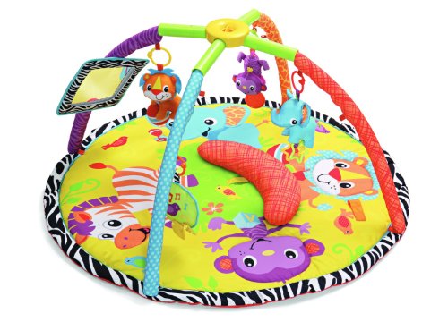 Unique twist and fold action makes using and storing this activity gym easy. Pops up in one simple motion and folds down for easy storage or travel. Comes with 4 linkable toys and bolster pillow for tummy time. Encourages reaching and engages baby's senses. Baby Animals Activiy Gym is in a circular shape, and has darling animal graphics.